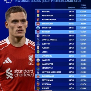 08月21日讯 德转统计了英超球队的单赛季引援支出纪录。目前,布伦特福德、伯恩利、利物浦和桑德兰4支球队都已创造了各自球...