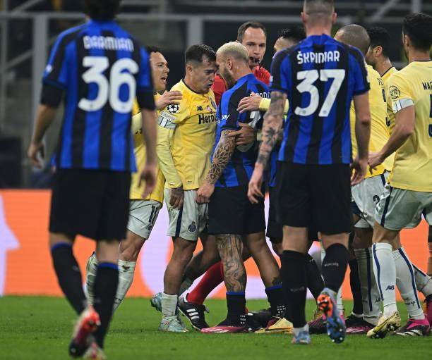 仅仅两分钟后,场上的气氛骤然改变。达米安在对抗中倒在波尔图禁区内,国际米兰索要点球,主裁约瓦诺维奇未予判罚。眼见队友受伤,奥纳纳将皮球踢出边线,然而波尔图中场奥塔维奥,居然利用这一界外球发动快攻,他正准备带球长驱直入,被巴斯托尼一把拽住。奥塔维奥显然不相信费厄泼赖,蓝黑众将相当愤怒,双方在场上爆发大规模争执,奥塔维奥作为始作俑者,也吃到了一张黄牌。