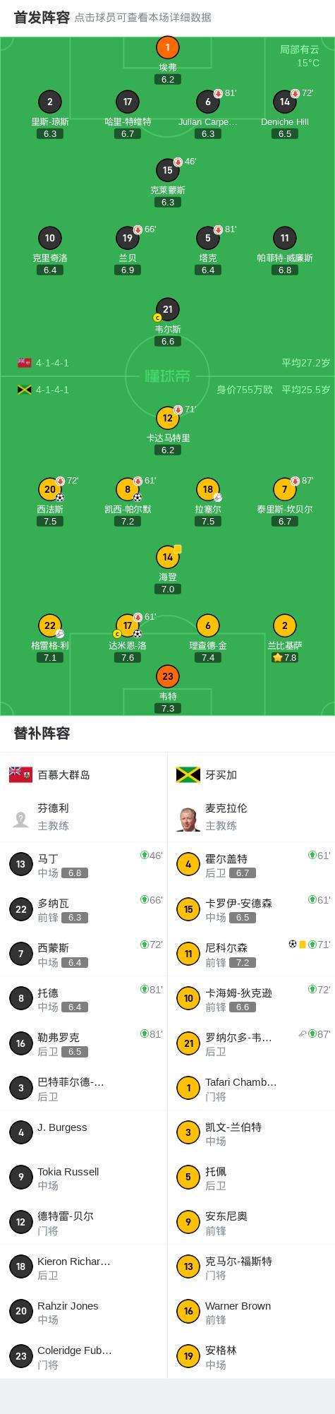 北京时间9月6日,2026年世界杯中北美洲及加勒比海地区预选赛第三阶段展开角逐,百慕大群岛迎战牙买加。比赛中,牙买加展现出强大的进攻实力。 比赛开始后不久,牙买加便由达米恩-洛打破僵局。随后,格雷格-利送出助攻,帮助西法斯再下一城,为球队扩大领先优势。进入下半场,拉塞尔精准传球助攻凯西-帕尔默破门,进一步巩固比分。比赛接近尾声时,罗纳尔多-韦伯斯特传中助攻尼科尔森破门,将比分最终定格在4比0。 凭借全场比赛的出色表现,牙买加以4比0完胜百慕大群岛,取得关键三分。